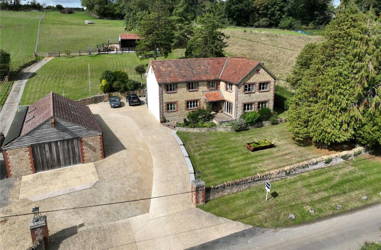 An exceptional four-bedroom detached country residence with stables, paddocks and a substantial split-level barn, set withing grounds of approximately 1.7 acres in the sought-after village of Bratton Seymour, Somerset. This beautifully appointed home combines elegant interiors with extensive outdoor amenities, offering the perfect blend of outdoor charm and modern living. Thoughtfully finished with solid oak doors, joinery and quality fittings throughout, the house also benefits from modern eco-credentials, including solar panels and an air source heat pump.