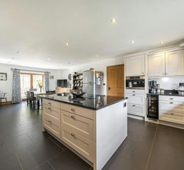 A covered entrance to a solid wooden front door opens into a welcoming hallway with inset coir matting, oak flooring and an impressive half-turn oak staircase rising to the first floor. The generously proportioned living room is a standout feature, with oak flooring, two front facing windows and French doors opening to a South facing sun terrace overlooking the front garden. A Harmony 10kw log burner, set on a stone heath, provides the focal point. The formal dining room, also with oak flooring, is an ideal entertaining space with French doors leading to the rear patio. The kitchen is a true highlight of this home, fitted with dove grey shaker style units under black granite worktops, complemented by a large island with breakfast bar and further space for a table. Triple aspect windows flood the space with natural light, and high specification appliances include two eye-level Miele ovens, Miele induction hob with extractor, Neff dishwasher, wine cooler and Miele coffee machine. A Villeroy & Boch Belfast sink, recycling drawers and space for a fridge/freezer complete the room. Double doors open to the rear patio and underfloor heating ensures year-round comfort. A utility room with matching cabinetry, Belfast sink, granite worktop and external door to the rear patio also features a laundry chute from the first floor. A cloakroom with Victorian high-level WC and coat cupboard completes the ground floor.