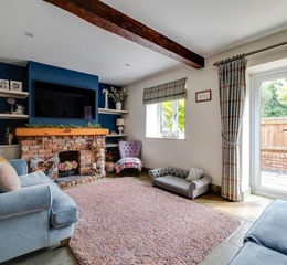 The main living room continues the flooring and underfloor heating and features an exposed brick fireplace with a working coal fire, built-in shelving and storage, and French doors that open onto the sunny, paved front garden bordered by decorative pebbles. Throughout the house, the windows and doors have been recently upgraded to UPVC, and thoughtful design touches like window seats add to the cottage’s cosy appeal.