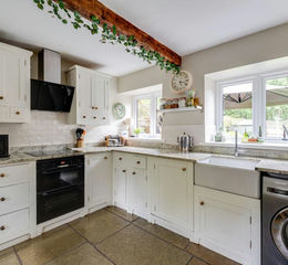 Inside, the cottage combines warmth and charm with modern finishes. A stable door opens into the stone-flagged hallway, with exposed beams and stylish recessed lighting. The wood-panelled walls and soft neutral tones continue into the kitchen, which has underfloor heating and traditional hand-built timber units with solid granite worktops. A ceramic Belfast-style sink sits beneath one of four windows, flooding the space with natural light and offering views of the garden. The kitchen also features a built-in dishwasher, Bosch hob, electric oven and grill, space for a large American-style fridge freezer, and cleverly hidden storage for the tumble dryer and washing machine.
