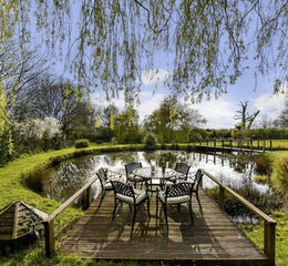 The grounds of the property are another highlight. Measuring some 3.5 acres, the gardens have a park-like quality with many mature trees and a beautiful pond with a wooden bridge and raised decked seating area, as well as a charming shepherds hut. Nearest the house an expansive patio sun terrace overlooks the level lawns, and there is a detached timber clad air conditioned indoor pool house with bi-folding doors. In a tucked away part of the garden there is a converted former apple store bothy cottage, which offers additional guest accommodation, as well as which there is a simply fantastic tree-house.