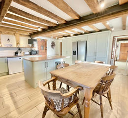 Step inside the main house and you’ll find a collection of versatile reception rooms, each packed with warmth and personality. Think exposed wooden beams, a roaring log burner and generous bay windows that pour in natural light. The modern open-plan kitchen/diner steals the show where bespoke cabinetry, heaps of storage, integrated appliances, a sociable island and rustic wooden flooring all come together to create the ultimate hub for feasts, festivities and family life. Continue through the ground floor to discover two further spacious living rooms and a stylish bathroom, plus a handy home office, cloakroom and utility room with matching kitchen cabinetry.