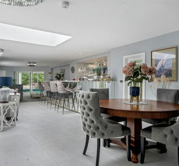 A modern addition to the property linking the home to the swimming pool and leisure complex. Added in 2020, this is a fabulous space for entertaining and parties consisting of a fully fitted bar, lounge and dining area. The room is fully tiled throughout with underfloor heating and benefits from wide bi-folding doors which open directly into the garden. A large central ceiling lantern floods natural light into the room and there is a wall mounted living flame gas fireplace. There is a fully fitted bar within the room with preparation sink, integrated oven, dishwasher and drinks fridge, mood lighting as well as an attractive glazed and mirrored display, large Quartz bar with overhang for stools beneath and wide sliding doors leading through to the swimming pool.