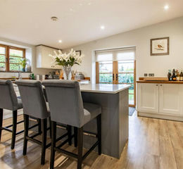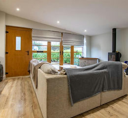 The living area to the front of the building is extensively glazed with double glazed windows and french doors opening to a south facing terrace. Feature exposed stone walling and beams and Contour wood burning stove set on flagstone hearth. Beamed opening to