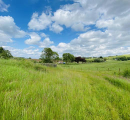 The outline of the plot is from the back of the outbuilding by the slow sign to the right, to a marked yellow post directly over the mound in the grazing pasture to the left along to the electric pole by the mature red trees at the park gate and back following the wall to the outbuilding. Reference to attached plan - Development plot tinted green, grazing land tinted yellow.