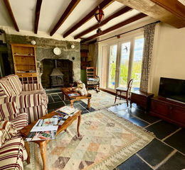 French doors to side commanding open countryside and mountain views, window to rear, exposed beams, exposed stone open feature fireplace housing a multifuel stove on a slate hearth, wall lights, staircase to landing, radiator, slate flagged flooring.