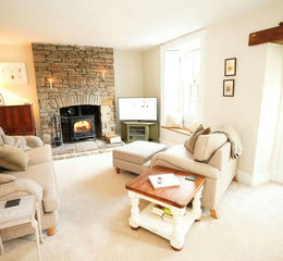 - 25ft living room with arch stone fireplace, wood burner, shutters and window seats