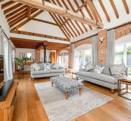 Lounge - 9.75m x 4.19m (32' x 13'9 ) - Solid oak flooring insulated beneath with Kingspan. Double glazed window and French doors to rear elevation. To the frontage there are three original arched reveals with tall, double glazed windows allowing plenty of natural light into the room. Additionally a set of French doors give access to the front garden . The centrepiece to the room is the brick inglenook style fireplace incorporating a timber beam and slate hearth which houses an ESSE, multifuel stove. Heavily beamed celling and full height vaulted ceiling with exposed A frame trusses.