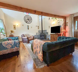 Lounge - 6.66m x 4.46m (21'10" x 14'7") - An impressive lovely light room open to the eaves with exposed beams to the ceiling, stairs rising to the first floor, oak flooring, windows to the front, side and rear, oak door to the rear garden, Hunter multi-fuel stove on a tiled hearth, two radiators, wall lights, TV point and telephone point. A door leads out to the front of the property.