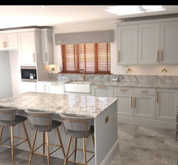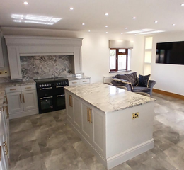 Twin ceramic sink unit set into marble worktops with cupboards and drawers below, with brass-style handles, with integrated dishwasher, integrated pull-out bin. Lamona microwave set into oven surround with cupboards above and below, flanked to one side by recess for American-style fridge-freezer, with matching side cupboards above and below. Matching range of wall cupboards with cornice over concealed lighting below. Matching canopy with recess for range-style cooker (Chef master 5 ring LPG with hotplate and twin ovens, warming oven, grill - available by separate negotiation). Matching overhead canopy has concealed cooker hood and cornice. Central matching breakfast island with marbled worktops, cupboards below.