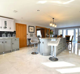 Kitchen/Breakfast/Living Room - 9.19m x 4.80m (30'2 x 15'9) - A beautifully appointed sociable entertaining space providing the hub of the home with the kitchen area appointed with a stylish range of base and wall cupboards complimented by granite work surface areas including a large central island with additional storage drawer units below, integrated dishwasher, ceramic 1 1/2 bowl sink unit with mixer tap and upvc double glazed window above, part tiled walls, granite upstands, Rangemaster six burner gas hob with extractor hood above, heated tiled flooring, inset lighting, plinth lighting, upvc double glazed bay window with central door leading out to the patio and oak veneer door to: