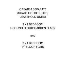 GUIDE PRICE £400,000-£450,000..... GDV £890,000, GROSS PROFIT £200,000, GROSS PROFIT MARGIN 22.5%, GROSS [COMBINED] MONTHLY RENT £4,700, GROSS [COMBINED] ANNUAL RENT £56,400, GROSS [COMBINED] RENTAL YIELD 9.4%..... SUB-DIVISION / CONVERSION PROJECT: SPLIT AN EXISTING HOUSE, TO CREATE 4 DISTINCT SEPARATE PROPERTIES...... 2 x 1 BED GROUND FLOOR 'GARDEN FLATS' (41.6m2 / 38.8m2) AND 2 x 1 BED FIRST FLOOR FLATS (37.2m2 EACH)..... SOLID FINANCIALS WITH LOW RISK