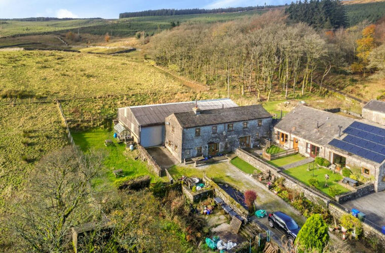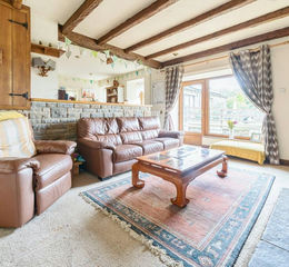 The property sits within approximately 1.5 acres, including formal gardens, lawned areas, paved seating, and a generous paddock. There is ample private parking at the front and side, a woodland area, and a large barn with planning permission to create a five-bedroom extension. The barn currently has a concrete floor, water, power, and sewerage connections, providing further potential for development. The setting offers a tranquil rural lifestyle with unbroken views and plenty of space for outdoor living, hobbies, or keeping animals.