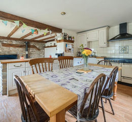 The ground floor comprises a generous entrance hall with ornate wood doors and a tiled floor, a cloakroom with low-level WC and hand basin, and a utility room with ample storage and space for appliances. The farmhouse-style kitchen and dining room is bright and spacious, featuring solid wood worktops, a large electric Rangemaster cooker, integrated fridges, dishwasher plumbing, ceramic sink, wood flooring, and a log-burning stove. There is also a study/snug with exposed stone, beams, and a multi-fuel stove, perfect as an office or secondary living area.