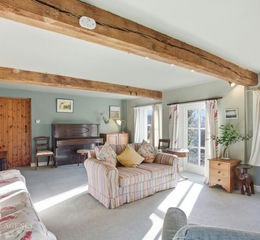 Inside, the light-filled conservatory offers serene views over the garden, while the spacious living room, complete with exposed beams and a feature fireplace, creates a cosy space to gather. The dining room has large windows that flood the room with natural light, and the study provides lovely views and quirky touches that make it a truly inspiring workspace. Around the home there are plenty of storage areas too, keeping the house calm and clutter free.