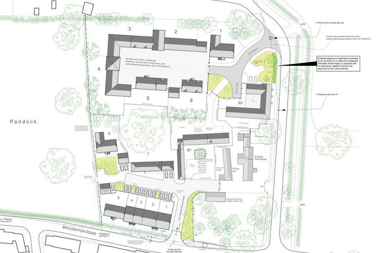 Application 22/1563/OUT comprises 3no. detached dwellings and 3 further dwellings linked in a courtyard composition. Application 24/1035/FUL comprises 2no barn conversions, 2no. detached dwellings and a row of 5 terraced properties. The site benefits from two accesses; one to the north-eastern corner of the site off Bassingham Road and the other to the south of the site off Broughton Road. The dwellings with outline permission are indicative in design and subject to detailed design at Reserved Matters stage.