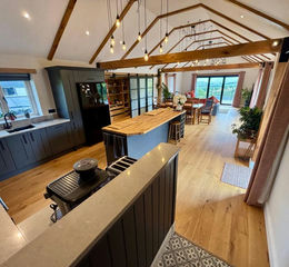 40' 0" x 15' 7" (12.19m x 4.75m) The heart of the home is undoubtedly the stunning open plan kitchen and dining areas. A spectacular area designed for modern family and social gatherings. It enjoys an open, vaulted, beamed ceiling and 2 sets of bi-fold doors that flood the space with natural light and easy access onto the terrace patio. It also enjoys sweeping views across the valley.