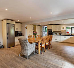 To the right, double doors lead into a generously sized dining kitchen, fitted with an extensive range of units, a variety of integrated appliances, and space for an American-style fridge freezer. There's ample room for a large dining table, making it ideal for family gatherings and entertaining. A stable door opens from the kitchen into the conservatory, which in turn leads out to the beautifully maintained garden.