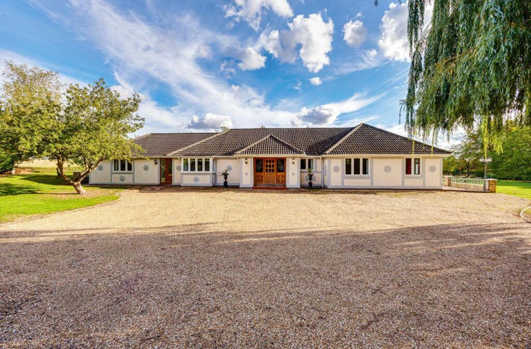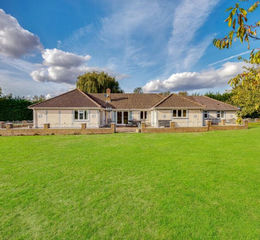 A substantial five-bedroom detached bungalow tucked away along a private gravel drive in the sought-after village of Withersfield. Set in around 1.19 acres of mature, secluded grounds backing onto open paddocks and farmland, this versatile home features elegant open-plan living spaces, a superb principal suite, and a separate utility/guest wing with annexe potential. Outside is a large paved terrace for entertaining, sweeping lawns with a natural pond, and a triple garage/workshop with power, light and eaves storage. Offered to the market chain free.