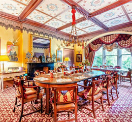 The Impressive dining room comprising a central fireplace with surround and mantlepiece, attractive ornate crossed wood ceiling, and large full height arched sash windows providing excellent natural light and views over the house gardens.
