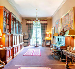 Imposing Drawing room with renaissance stucco plaster ceiling, oak floor, and large central fireplace with marble surround and mantlepiece. A wonderful full height bay window affords excellent natural light with a window seat overlooking the house gardens. The room is completed by book shelving and French doors to garden.