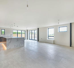 Upstairs, the principal suite includes a dressing room and luxurious en-suite with both walk-in and over-bath showers. Three further double bedrooms share a sleek family bathroom, while a fifth bedroom or study enjoys its own en-suite shower room.