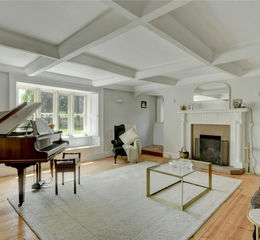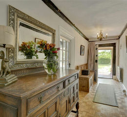 The gardens at The Chantry are as enchanting as the house itself, approached via a charming, slatted garden gate set between traditional pillars crowned with sandstone balls. A stone path meanders through the lawned gardens to the front door, opening onto a broad terrace that spans the front of the property. The south-facing lawns are shaded by a variety of mature trees, including a stunning Copper Beech, and offer several delightful seating areas perfect for relaxation.