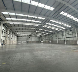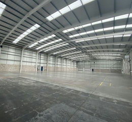 The property comprises a distribution warehouse built in 2001 of steel portal frame construction, metal profile clad elevations and a barrel vaulted metal clad roof. The front elevation is glazed with metal cladding above. The warehouse has 3 level access doors and 1 dock level loading door. The unit has an eaves height of 8.17 metres. Lighting within the warehouse is provided by sodium light boxes and heating by 4 gas fired warm air blowers (not tested).