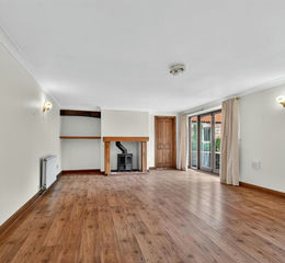 SITTING ROOM extends to over 23ft in length and enjoys a dual aspect outlook the front and side. To one side there is a feature cast multi fuel burning stove with tiled hearth and solid oak surround flanked by a shelved recess and double French doors leading out to a courtyard.