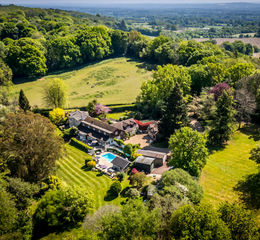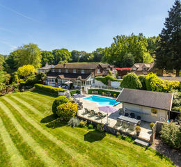 The property is set back from a quiet access lane and approached by a sweeping drive that passes through the parkland to the parking area where there is ample space for a number of vehicles. The detached, oak garaging provides covered parking for three cars and has an external staircase leading up to a first-floor studio with kitchenette. The gardens and grounds extend in total to just over 5.25 acres and are landscaped to reflect the beauty of the local Surrey countryside, as well as more formal and outdoor entertaining areas. To one side is a paved courtyard with Renaissance style water fountain, capturing the morning sun and an ideal spot for breakfasting in good weather. Here there is also a kitchen garden with raised beds and a greenhouse. Adjoining the rear of the house is stone terracing with steps leading down to wide expanses of well-tended lawn, a waterfall feature, a second Renaissance style fountain and a formal pond with small fountain. The terracing extends to a fenced pool terrace with a magnificent, heated swimming pool and an attractive, cedar summer pavilion where there is an infrared sauna. The park-like grounds have some wonderful indigenous and specialist tree and shrub varieties include a majestic eucalyptus, oaks, fir, azaleas and rhododendrons. The fenced paddock is bordered by spreading oak trees forming light woodland through which dappled sunlight cascades through and where there are carpets of bluebells in the spring. Adjoining the parking area are stables with three loose boxes with a lockable area behind where there are further storage sheds and a secure barn.