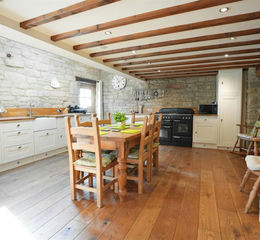 Dining Kitchen - 8.43 x 4.86 (27'7" x 15'11") - Base units. Wood worksurfaces. Ceramic sink. Rangemaster gas range. Integrated dishwasher. Exposed stone walls. Ceiling beams. Radiator. Stable door to front elevation. Wooden windows to front and side elevations.