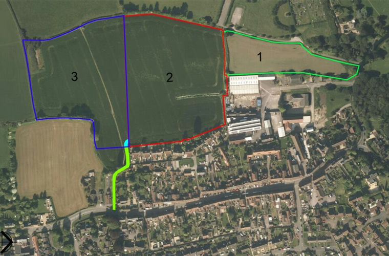 Lot 2, edged red and extending to approximately 9.25 acres of arable land with access over the area filled green and light blue on the plan, taken from High Street. A footpath crosses the land.