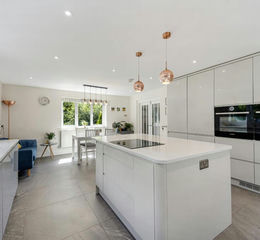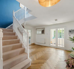 Upon entering the home, a welcoming entrance vestibule opens into a spacious hallway, elegantly finished with herringbone flooring that continues throughout much of the ground floor, lending a sense of cohesion and warmth. To the right of the hallway lies a generous breakfast kitchen, thoughtfully designed with an extensive range of floor-standing and full-height units topped with luxurious quartz work surfaces, which are also featured on the central island. The kitchen is well-equipped with a suite of integrated BOSCH appliances, including a double oven and induction hob, and provides ample space for a large family dining table. An adjoining conservatory, overlooking the rear garden and neighbouring fields, enhances the kitchen’s connection with the outdoors and floods the space with natural light.