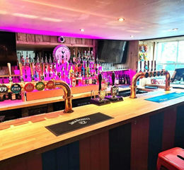 Back bar is rustic wooden panelled with two large flat screen TVs.