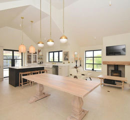 A beautiful triple aspect open plan living area with a vaulted panelled ceiling offering a spacious family living space. A range of floor level drawers and cupboards, Double Belfast sink set in granite worktop, Siemans induction hob with pot filler tap and extractor over. Integral dishwasher and fridge. Double eye level ovens. Island with seating area. Double doors to side. Log burner in tiled surround and slate hearth and oak mantel over.