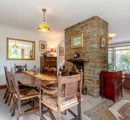 Step inside this beautifully designed home, where the main living accommodation is thoughtfully positioned on the first floor to take full advantage of its picturesque surroundings. Entering through the side patio doors, the dual-aspect kitchen welcomes you with a range of fitted wall and base units, alongside ample space for dining. A door leads into the main hallway, plus this room connects seamlessly to the adjacent dining room. At the heart of the home, a striking central stone fireplace divides the dining area and the spacious living room, creating a warm and inviting atmosphere.