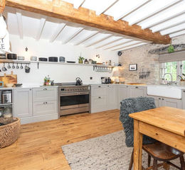 The interior is a joy to behold with exposed feature stone walls, beamed ceilings and two principal symmetrical rooms offering back-to-back fireplaces, both of which come fitted with wood burning stoves whilst the dual aspect kitchen comes fitted with quality fitted units topped off with solid quartz/granite worktops, dual Belfast sink and range oven plus neat touches of a window seat, exposed lintels and engineered oak flooring. From the Lounge, an opening to the original outer wall welcomes you to the newer addition, a superb Day Room/3rd bedroom with pitched ceiling, patio doors and touches that are carried through from the older section.