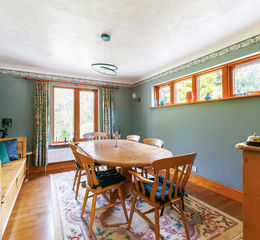 You enter into a large central entrance hall with a half-landing staircase and a spacious built in cloak cupboard. The reception spaces include a bright living room and adjoining dining room stretching the full width of the house. The living room features a Jotul wood-burning fireplace and double doors leading to the rear terrace and grounds. There is a well-appointed kitchen to the front with a large walk-in larder and separate utility room. In addition, the ground floor houses a cloakroom and good-size double bedroom with en-suite. Upstairs leads to the central vaulted family/study space with double doors which open onto a large balcony overlooking the beautiful garden and woodland beyond. There are three double bedrooms including a generous principal bedroom benefiting from its own en-suite bathroom and triple built-in wardrobes, and a large family bathroom.