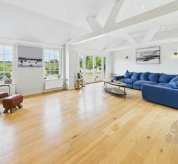 The reception hall sets the tone with natural stone flooring and leads to a series of inviting rooms, including a dining room within the Tudor heart of the house, complete with exposed timbers and an original open fireplace. A snug/sitting room and further study offer flexibility, the latter with access to a Jack and Jill shower room. The vaulted kitchen and breakfast room is a striking feature, with full-height windows, a central island and access to the outside courtyard, creating the perfect space for both entertaining and everyday living. The main family room, with oak floors and a dramatic vaulted ceiling, opens directly onto a terrace, overlooking a feature pond as well as breathtaking views across the Stour Valley.