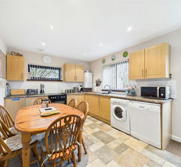 Dual aspect windows to front and side elevation. A range of base and eye-level units with worksurface above with an inset 1.5 bowl sink with mixer tap and drainer. Beko oven and hob as well as space for a washing machine/tumble dryer, dishwasher and freestanding fridge/freezer. Space for a dining table, vinyl flooring and radiator.