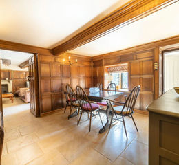 The welcoming front porch opens into a stunning lounge filled with natural light from French doors and double-glazed windows, complemented by wood panelling, exposed beams, a tiled floor, and a feature fireplace housing a solid-fuel burning stove. The formal dining room continues the period theme with elegant wood panelling, tiled flooring, and exposed beams. A useful downstairs cloakroom includes a wash hand basin set in granite and a low-level WC.
