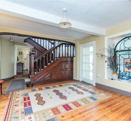 Wood floor, understairs cupboard, open fire with marble fireplace, stained glass window.