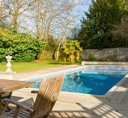 The family garden, accessible from the kitchen/utility area, features a swimming pool with electric cover and Millboard decking, lush lawns, and a spacious patio for outdoor dining.