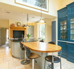 Accessible from both the study and hallway, a well-appointed kitchen/breakfast room awaits. Featuring handmade shaker-style units from Kitchen Elegance, a central island with an Italian marble countertop, and an AGA with six-ring gas hob and dual electric ovens, this space is both functional and stylish; complimented by Limestone flooring. A breakfast bar extends from the island, while a generous alcove serves as a pantry with built-in Neff and Miele appliances. The extended rear section of the kitchen floods with natural light from large windows and Velux skylights.