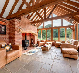 Being oak framed, exposed beams, roof trusses and sealed double glazed picture windows and French doors onto three sides taking full advantage of views over the magnificent gardens, grounds and Outwoods. Attractive flagstone flooring and inglenook style fireplace housing a Jotul wood burning stove on a brick hearth with oak mantel over and exposed brickwork. Underfloor heating.