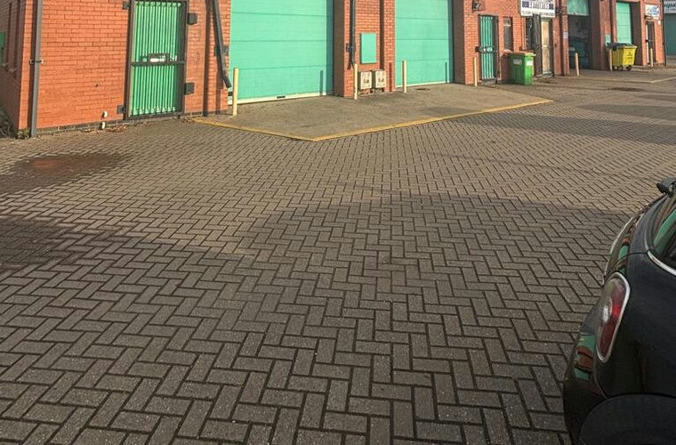 The property comprises a mid-terrace unit of steel portal frame construction with brick elevations, under a pitched corrugated roof incorporating rooflights. Internally, there are painted block walls.