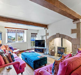The ground floor opens up to reveal a surprisingly spacious and flexible layout, well suited to both everyday family life and entertaining. Living space includes a kitchen and dining area, sitting room, family room, separate dining room and a useful home office, supported by a utility room and cloakroom. Many original features have been retained, including exposed oak beams, vaulted ceilings, character fireplaces and stone flooring, all of which add warmth and depth to the accommodation. Several rooms lead directly out to the gardens, where private and secure seating areas make the most of the setting.