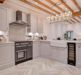 Step inside and you’re welcomed by a spacious entrance hall leading into the impressive open-plan kitchen, dining, and living area. This contemporary space features a high-specification kitchen with quality cabinetry, integrated appliances, and a stylish breakfast bar — perfect for entertaining guests or relaxed family gatherings. The adjoining lounge area enjoys French doors opening onto the rear garden, while exposed beams add a touch of traditional character to the modern design, creating a warm and inviting atmosphere.