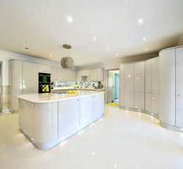 and entertaining. The Kitchen is fitted with sleek grey curved units topped with white granite work surfaces. A central island houses the hob and offers additional storage beneath, while two built-in, eye-level ovens and integrated fridge freezer and dishwasher, sink and drainer complete the space.