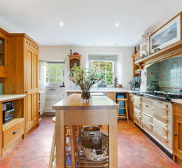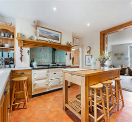 The kitchen is situated at the rear of the property and conveniently has a split barn door opening onto the rear drive. Being a true farmhouse kitchen, this space is set around a four oven aga and has a range of wall and base units and an large integrated fridge. Large folding doors lead into the snug room, set around a feature open fireplace with an outlook over the front garden, an ideal space for everyday living and family life.